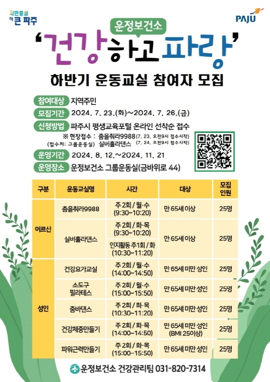 파주 운정보건소는 ‘건강하고파랑’ 대면 운동교실에 함께할 참여자를 7월 23일부터 26일까지 선착순으로 모집한다고 밝혔다.