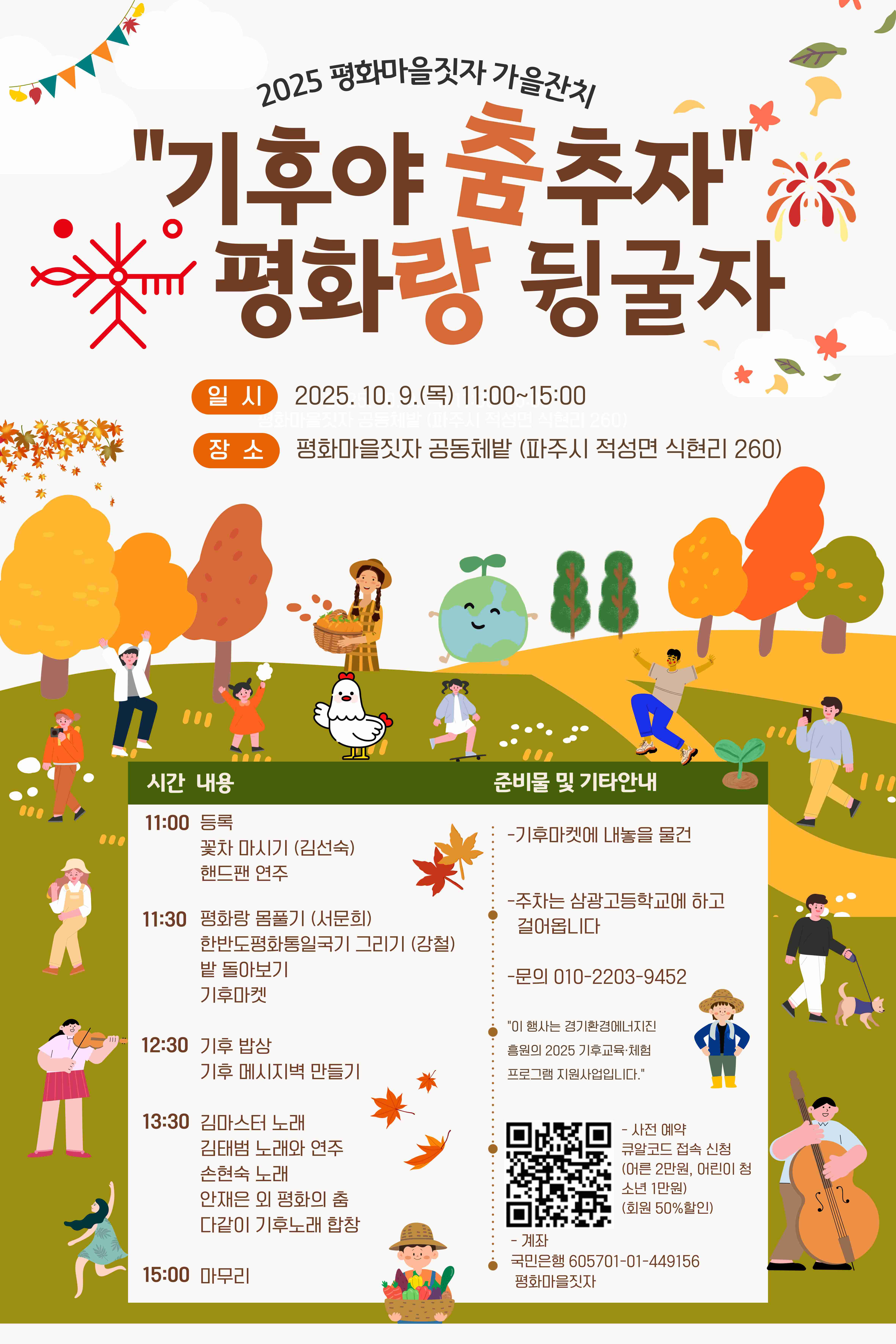 평화마을짓자가 네 번째로 개최하는 가을잔치는 파주시 적성면 식현리 260에서 열린다. 참가비는 2만원이며 어린이 청소년은 1만원이다. 주차는 삼광고등학교 후문 주차장에 하고 걸어온다.