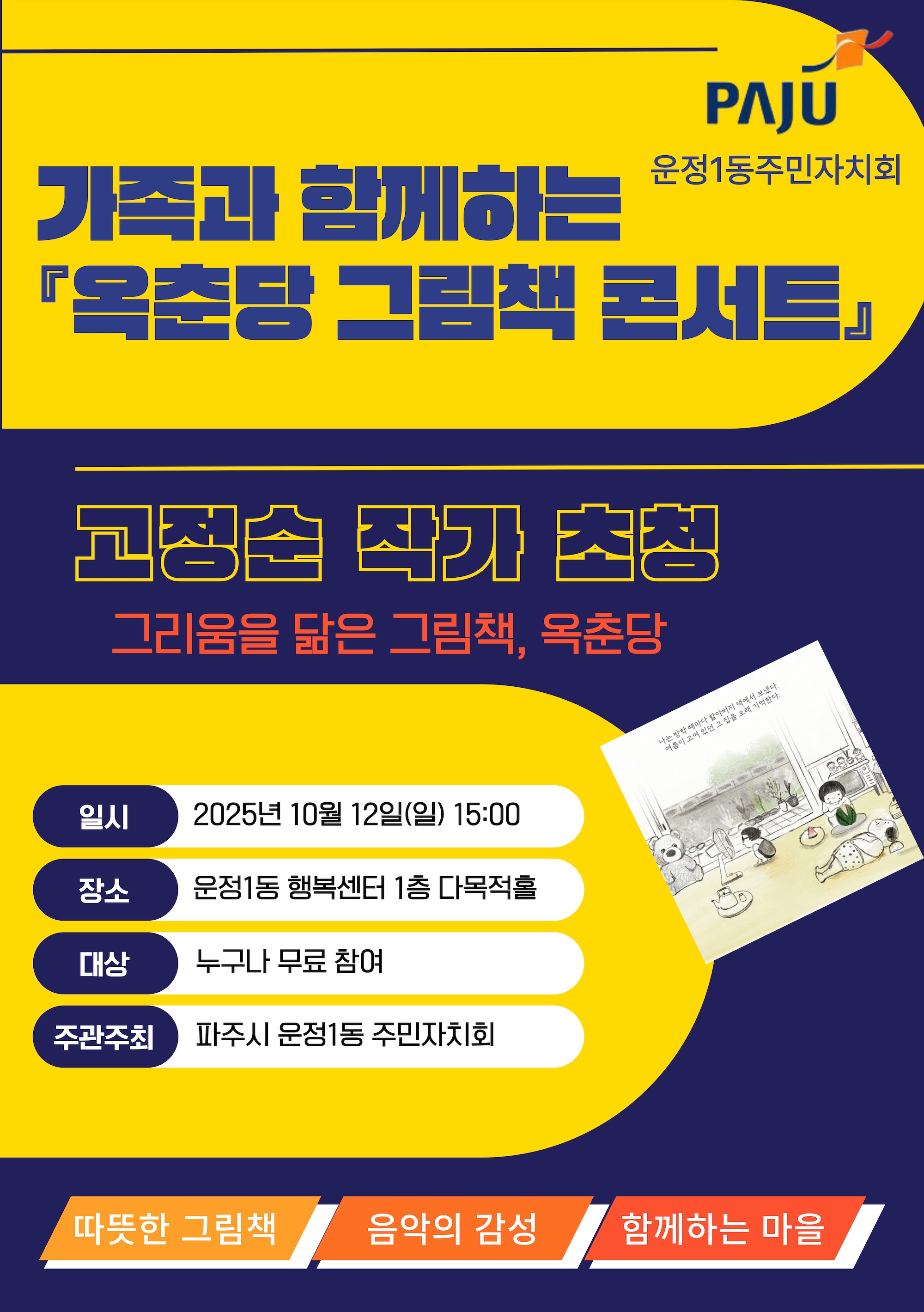 가족과 함께하는 "옥춘당 그림책 콘서트" (고정순 작가 초청) - 10.12 (일) 15시, 운정1동행복센터 1층 다목적홀