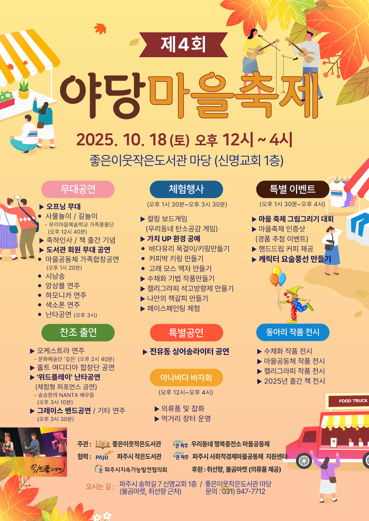 제4회 야당마을축제 - 10.18 (토) 오후 12시, 좋은이웃작은도서관 마당 (신명교회 1층)