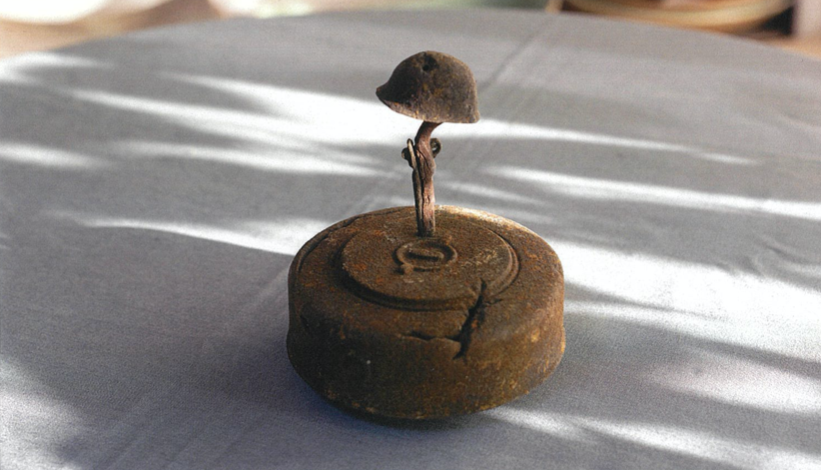 철모에서도, 맞잡은 두 손에서도, 지뢰에서도 투명하고 청아한 소리가 난다. 이것도 죽음과 삶을 하나로 엮은 것처럼, 물질과 청아한 소리를 하나로 엮은 것 같다.