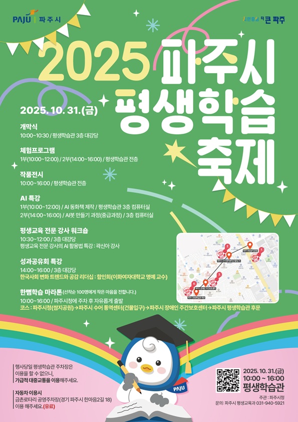 김경일 파주시장은 “이번 평생학습축제는 시민이 주체가 되어 배우고, 나누며, 함께 성장하는 시민 중심의 축제”라며 “앞으로도 평생학습이 생활 속에서 자연스럽게 이루어지는 도시, 모두가 배우는 파주를 만들어가겠다”라고 밝혔다.