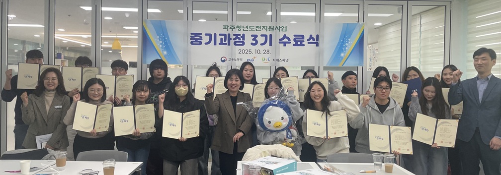 파주시는 고용노동부 공모사업으로 추진 중인 ‘2025년 청년도전 지원사업’의 중기 3기 수료식을 지난 28일 파주청년공간 지피(GP)1939에서 개최했다고 밝혔다.