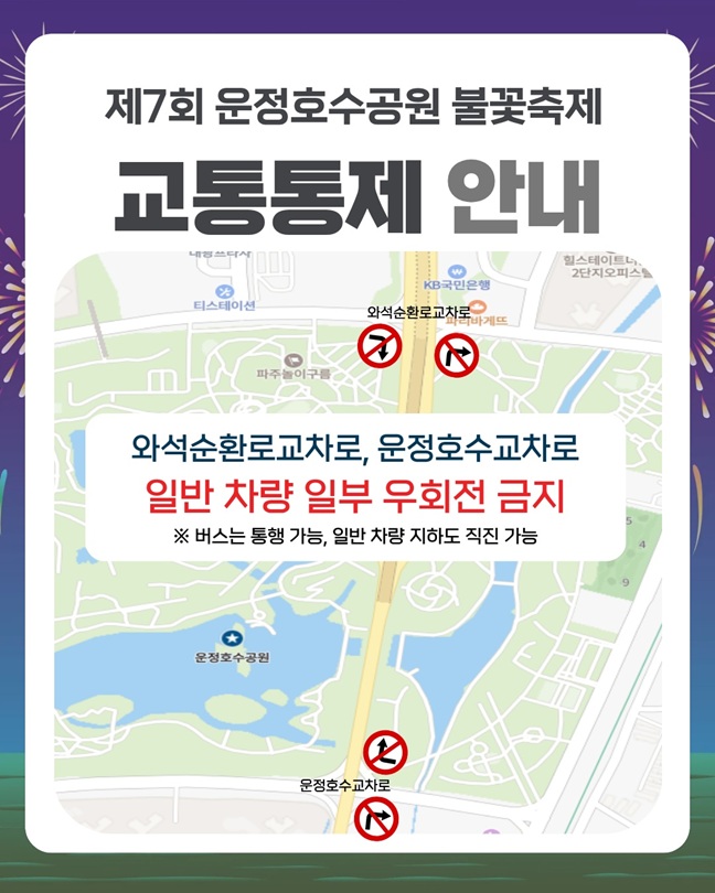 무엇보다 올해 파주시는 시민 안전을 최우선으로 하여 곳곳에 안전요원을 배치하고, 행사 당일 17시부터 22시까지는 축제장 주변 교통을 일부 통제할 예정이다. 특히 와석순환교차로와 운정호수교차로 사거리에서는 일반 차량의 좌회전이 전면 금지되며, 직진만 허용된다. 또한 일부 구간은 우회전도 제한될 예정이다.