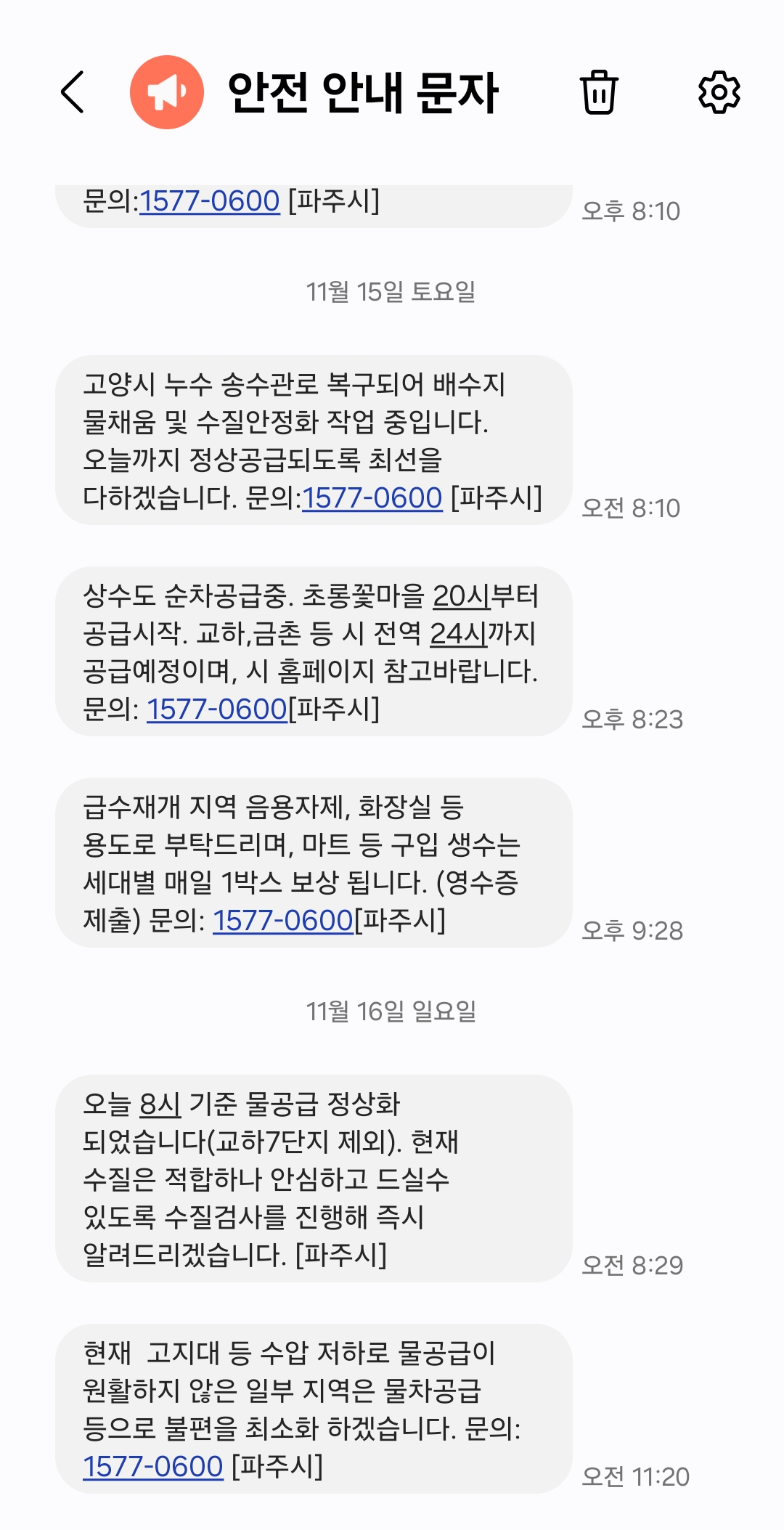 생수 배부 안내 문자에는 수자원공사로 연결되는 전화(1577-0600)를 적었다. 15일과 16일 내내 [파주시]라 적혀있는 문자에는 수자원공사 전화가 적혀있었고, 이 전화는 연결되지 않았다.