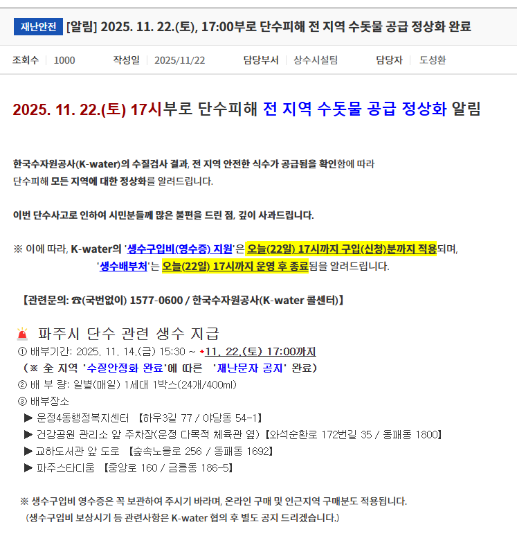 파주시는 홈페이지를 통해 ‘생수구입비 보상은 22일(토) 17시까지 구매분만 적용’한다고 공지했다. 생수 배부처 운영도 같은 시각 종료됐다.