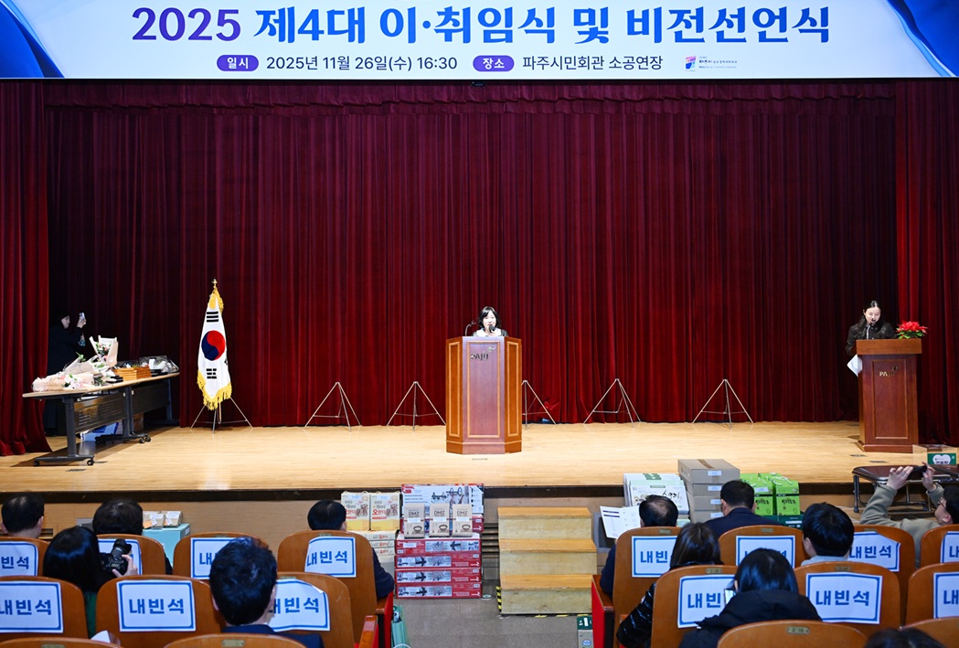 윤경자 ㈔파주시공유경제네트워크 전임 이사장은 이임사를 통해 “많은 분들의 동행 덕분에 공유경제네트워크가 꾸준히 성장할 수 있었다”라며 감사의 뜻을 전하고, “앞으로도 공유경제네트워크가 지역사회에서 역할과 기반을 더욱 단단히 다져가길 바란다”라고 전했다. 이어 협회기 이양이 진행되며 제4대 임원진의 출범이 공식화됐다.