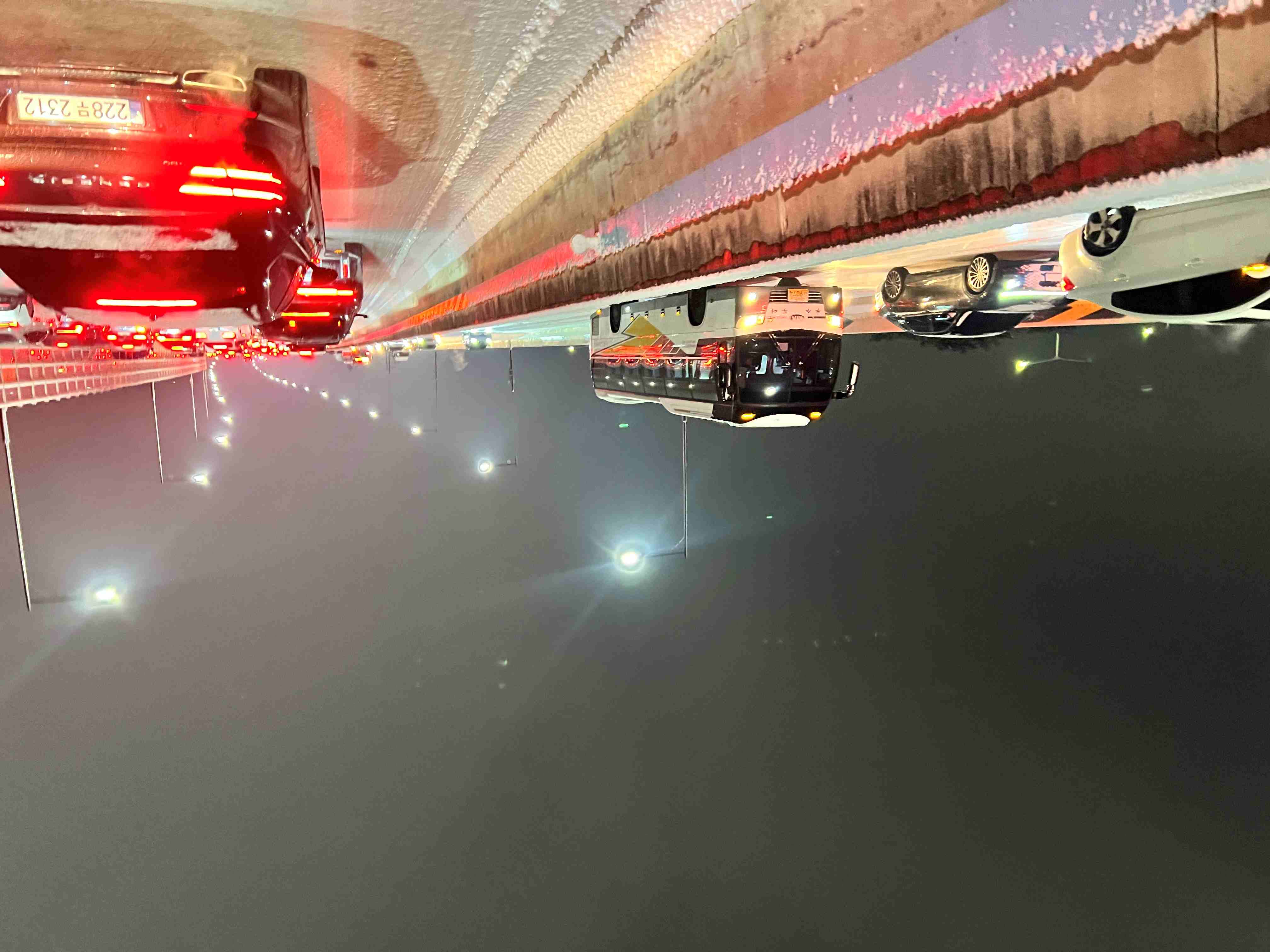 <> 탄현면 쑥고개길(인삼사우나에서 성동사거리 방향)에 발이 묶인 차량들, 반대편에서는 차가 내려오지 못해서 길이 텅 비어있다.