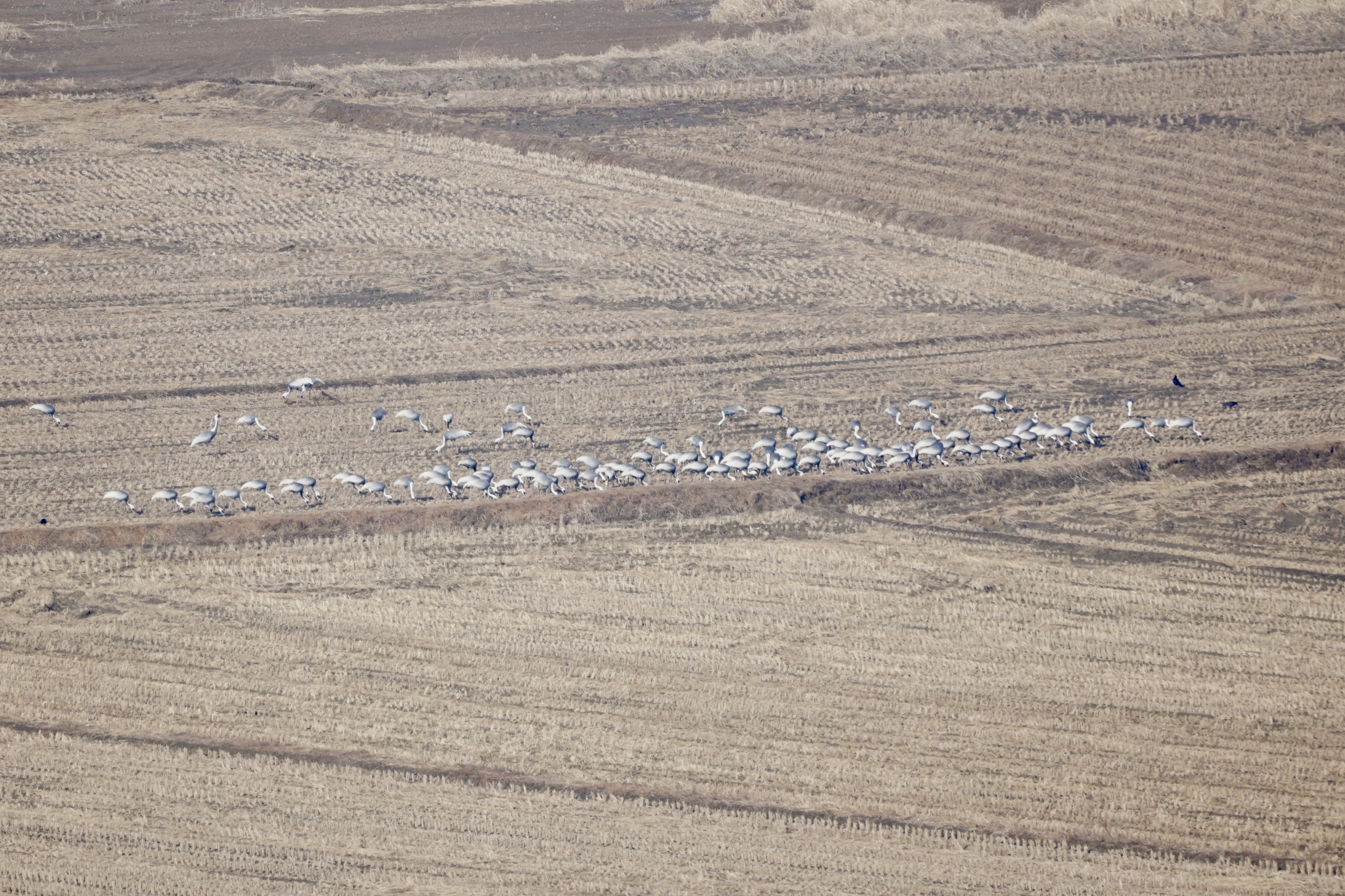 그리고 저~ 멀리 논에서 낙곡으로 허기를 채우는 재두루미 무리!! 내가 그동안 보고 싶었던 재두루미가 이렇게나 많았다. 사진 보다 훨씬 뒤쪽에도 큰 무리가 있었던 것으로 보아 대략 200여 마리가 있었던 것 같다. 사진에만 83마리이다.