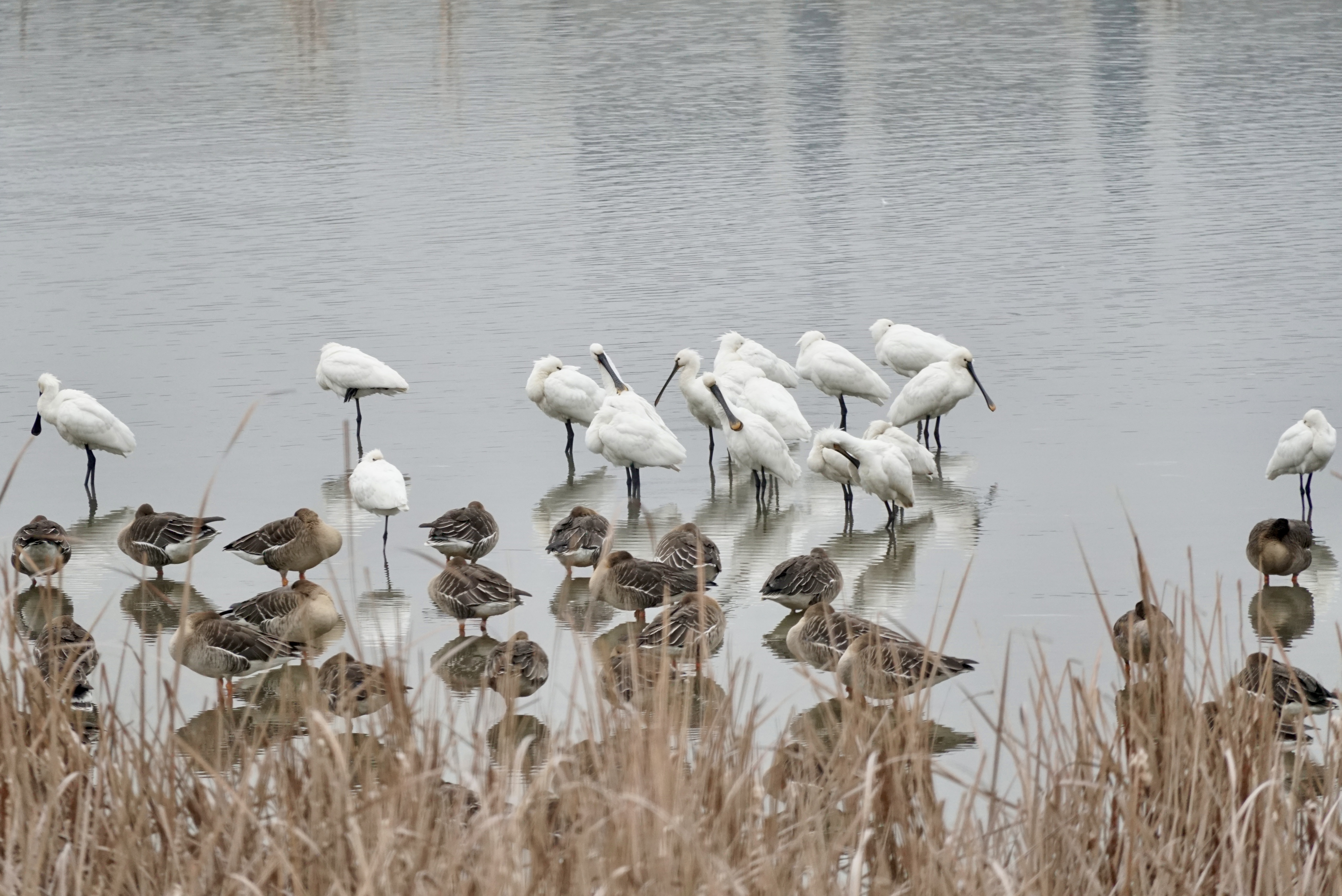잠에서 깨기 직전의 큰기러기 무리들, 출판단지 유수지에 온 목적은 첫째 개리, 둘째 노랑부리저어새다. 그리고 필드스코프를 시험하기 최적의 장소라는 점도 포함된다. 그러나 결론부터 말하면 개리는 못봤고, 노랑부리저어새는 여지껏 만난 중 가장 가까이서 만날 수 있었으며, 필드스코프는 정말 너무나도 만족스러웠다.