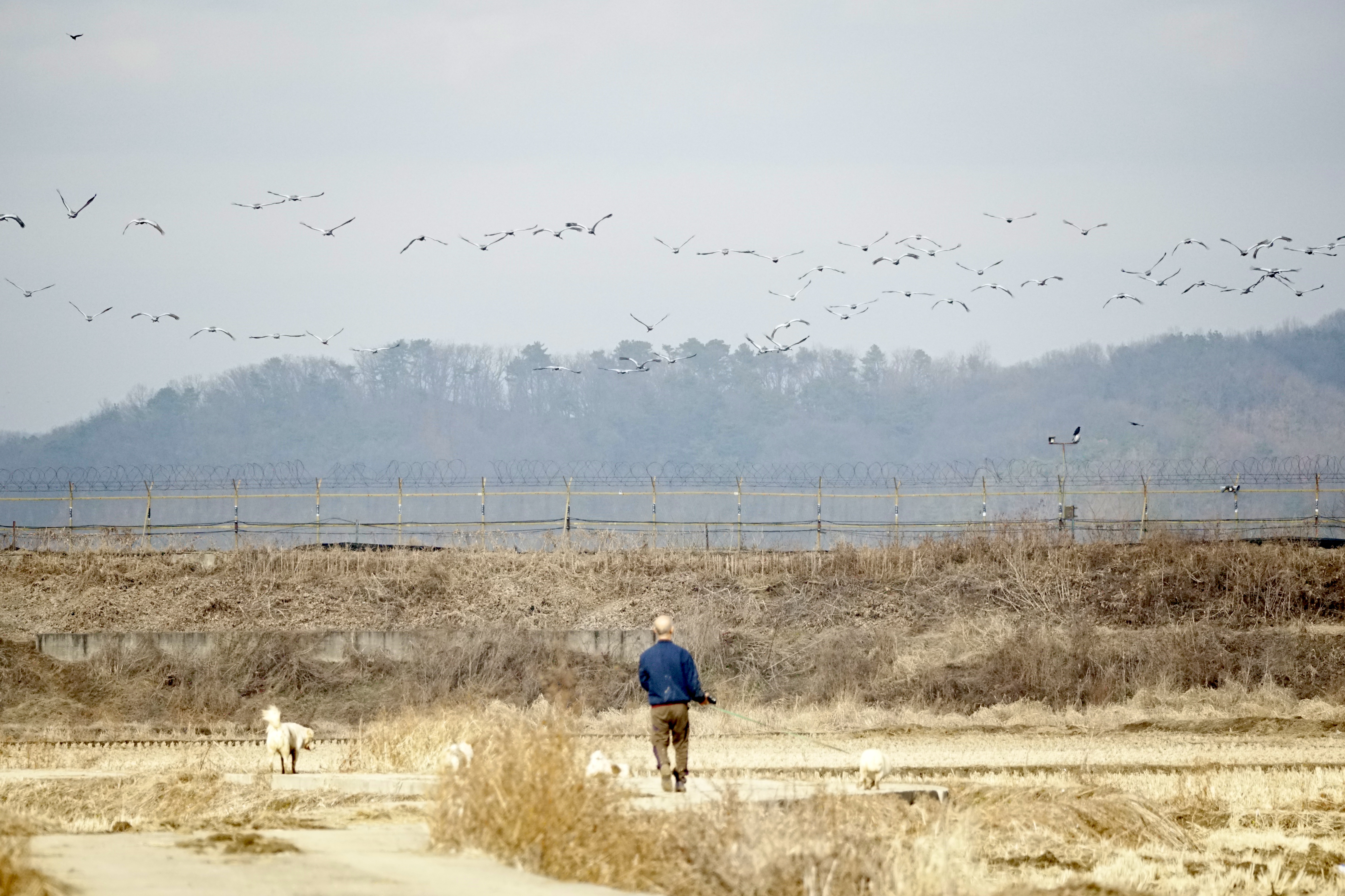 그런데 다른 변수가 생겼다. 동네 주민이 개들을 데리고 논을 가로질러 나타난 것이다. 나는 그를 말릴 타이밍을 잡지 못했고 두 번째 등장한 빌런 때문에 재두루미들은 날아갔다ㅜㅜ