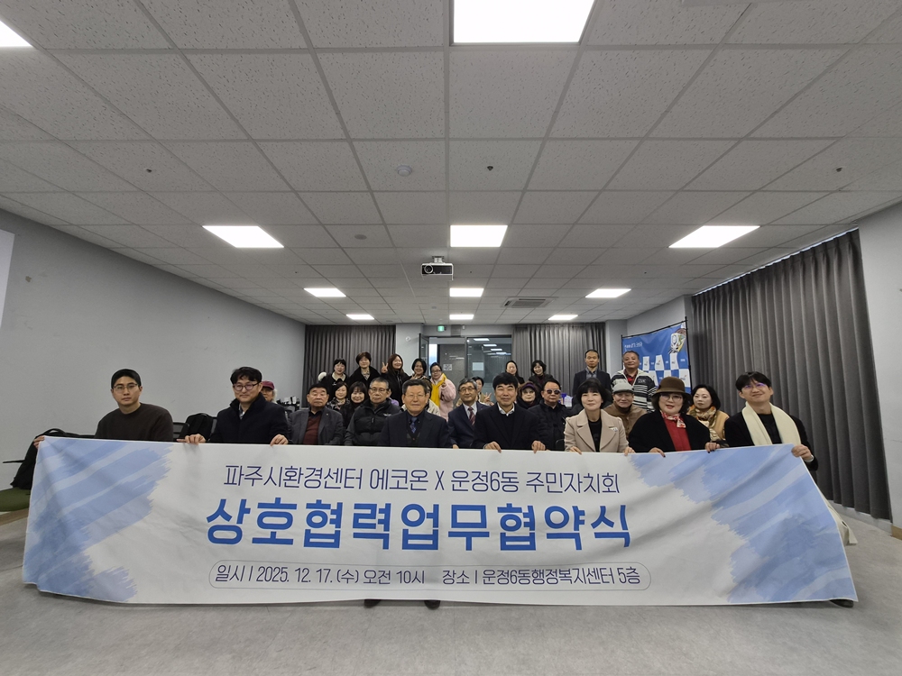 운정6동 주민자치회는 12월 17일 오전 10시, 운정6동 행정복지센터에서 파주시환경센터 ‘에코온’과 ‘지역 환경 의제 실천 및 기후행동 협력을 위한 업무협약’을 체결하고, 이어 마을 소식지 「초롱꽃향기로」 2호 제작 성과공유회를 개최했다.