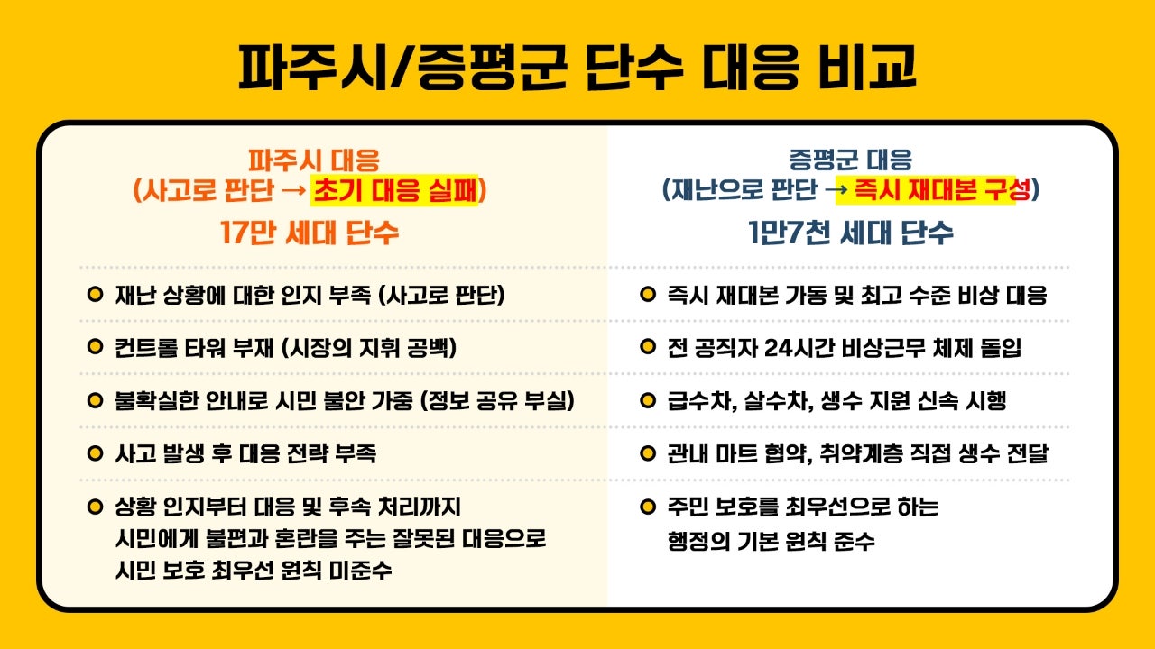 박은주 의원은 먼저 “23만 세대 중 17만 세대, 약 40만 명의 시민이 식ㆍ용수를 공급받지 못한 이번 사태는 기본 생활권·건강권·생존권이 침해된 사회재난”이라며, 재난 발생 시 재난안전대책본부 가동 의무를 규정한 「재난 및 안전관리 기본법」 제16조를 파주시가 이행하지 않은 것은 중대한 행정 책임 회피라고 지적했다. 또한 파주시가 이번 사태를 ‘재난’이 아닌 ‘사고’로 축소 판단한 것에 대해 “지자체로서의 본질적 책무를 방기한 것”이라고 지적했다.