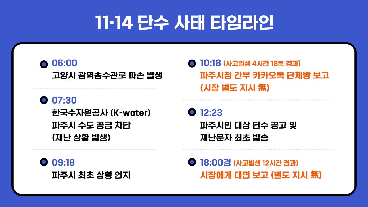 - 이번 대규모 단수사고는 고양정수장 이후 파주로 공급되는 광역송수관에서 발생한 비자연 재해성 관로 파손이며, 이에 대한 복구 결정권은 K-water에 있음.
