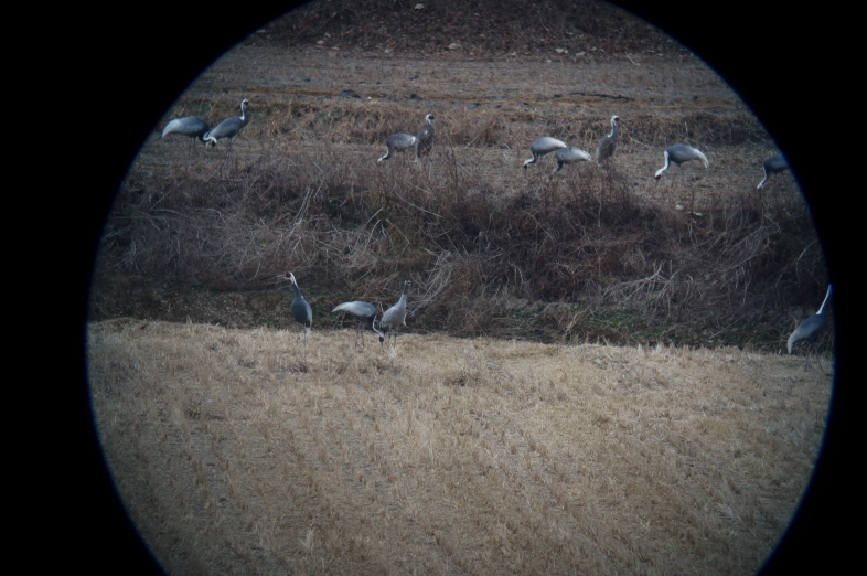 시베리아흰두루미를 봤던 곳에서는 재두루미 가족이 있었다. 다른 사람이 시베리아흰두루미 가족을 봤다는 곳에도 재두루미 가족이 있었다. 시베리아흰두루미는 이동기에 한 마리씩 재두루미 무리에 끼어 오는 건 해마다 봤는데 세 마리 한가족이 와 월동하는 건 처음이다. 매번 여기저기 있는 걸 보니 시베리아흰두루미 가족이 아직 땅을 장만하지 못한 것 같다. 임진강에 있을 것 같은데 민통선을 나와 장산전망대로 가야할 시간이다.