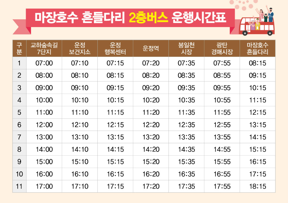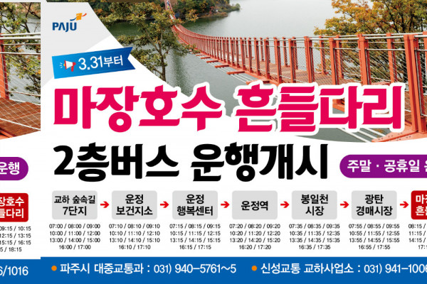 파주시는 5월 연휴기간(5.5.~5.7.)에 맞춰 마장호수흔들다리 운행 노선인 7500번을 3대에서 4대로 증차 운행할 계획이다.
