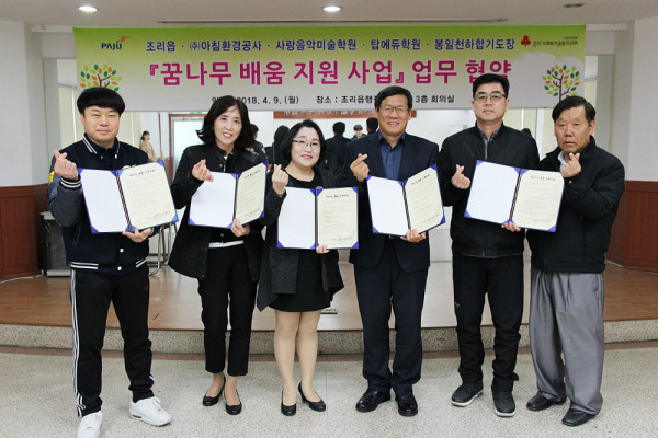 파주시 조리읍 행정복지센터(읍장 김순태)는 지난 9일 ㈜아침환경공사(대표 김영철·유명기) 및 관내 3개소 학원장이 참석한 가운데 저소득층의 사교육비 부담 해소와 교육기회 제공을 위한 ‘꿈나무 배움 지원 사업’ 업무협약을 체결했다고 밝혔다.