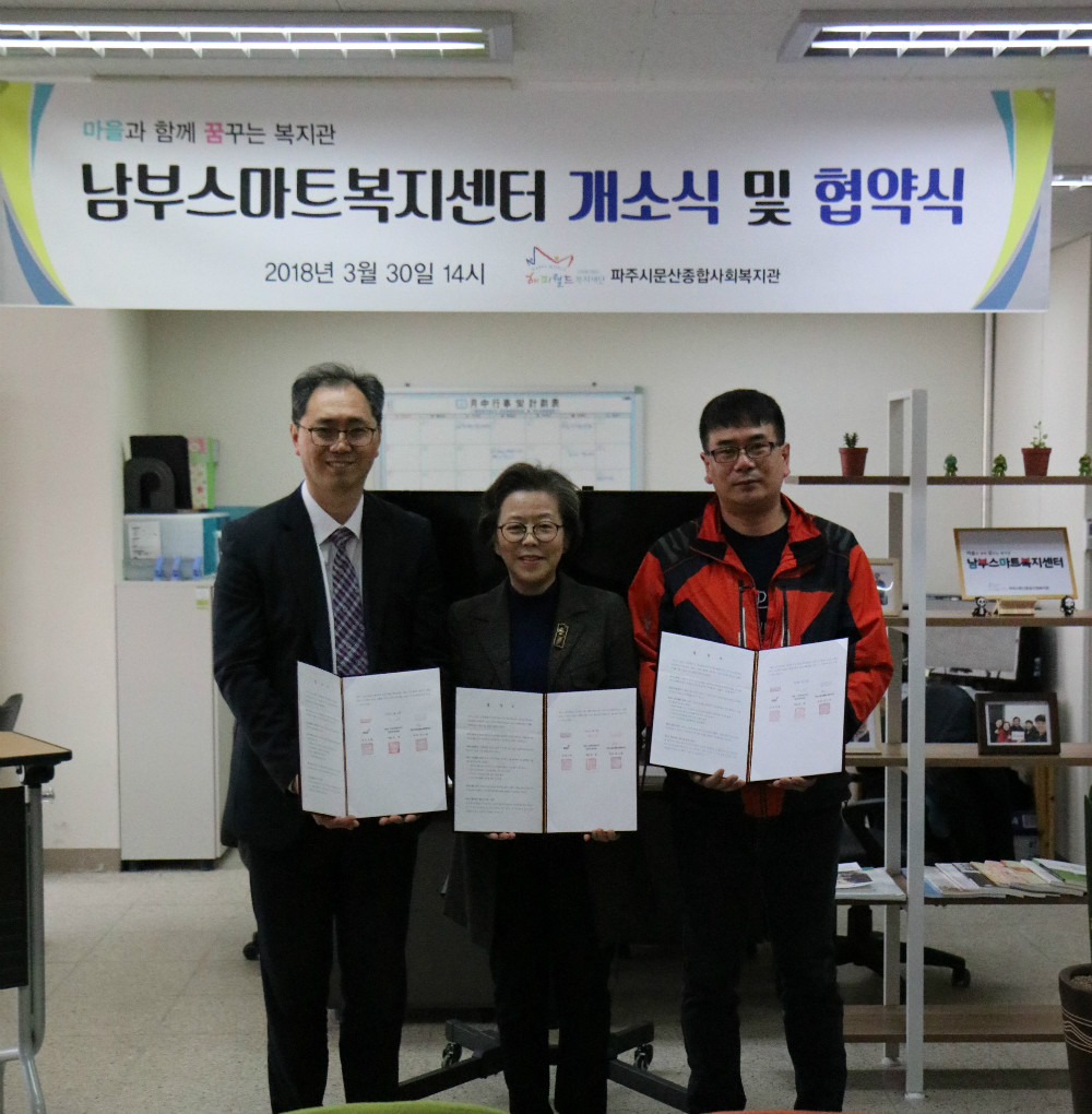 남부스마트복지센터는 지난해 운정 지역주민을 대상으로 욕구조사를 실시하고 지역주민의 복지욕구를 해소하고자 복지업무 수행을 위한 최소 공간과 SNS를 기반으로 하는 현장중심의 복지서비스를 제공하는 형태를 갖추고 개소하게 됐다. 센터 개소를 위해 지난 2월부터 파주시와 파주시 문산종합사회복지관이 협력하고 산내마을3단지 임차인 대표회의가 장소를 제공해 개소에 큰 역할을 담당했다.