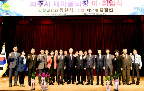 파주시 새마을회는 지난 16일 시민회관 소공연장에서 새마을회 임직원 및 기관단체장 300여명이 참석한 가운데 제12·13대 류한성 회장의 이임식과 제14대 김경선 회장의취임식을 가졌다.