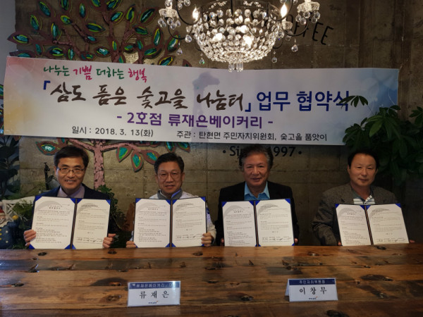 이날 관내 업체 류재은베이커리(대표 류재은), 메이찬(대표 신민숙), 베로키오(대표 육화숙), 모산목장(대표 김금산)이 차례로 「삼도 품은 숯고을 나눔터」 2·3·4·5호점으로 선정됐으며 업무 협약식을 체결했다.