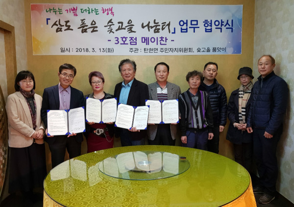 파주시 탄현면은 지난 13일 탄현면 주민자치위원회와 숯고을 품앗이(탄현면 지역사회보장협의체)가 관내 4개 업체를 「삼도 품은 숯고을 나눔터」로 선정하고 업무 협약식을 가졌다고 밝혔다.
