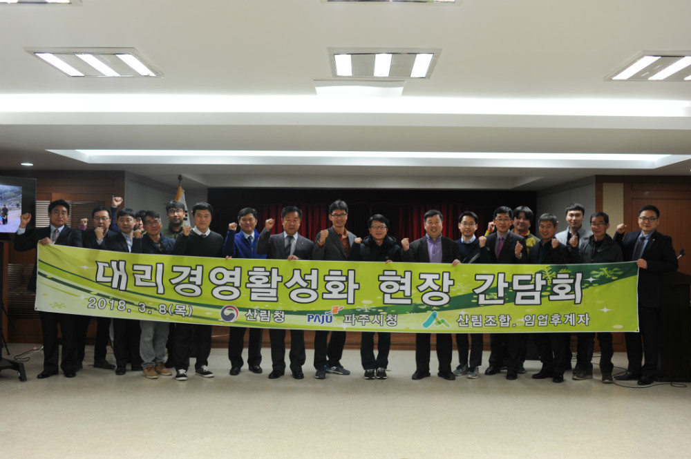 파주시산림조합(조합장 이성렬)은 국가 정책방향에 맞추어 산주의 경제적, 사회적, 문화적 지위향상을 도모하고 산림경영에 대한 일체의 사항을 위탁 대행하는 대리경영제도를 추진하기 위하여 산림청, 파주시, 산주․임업인, 임업후계자, 임산물작목반, 산림경영지도원, 정책자금담당자 등 20명이 참석하여 대리경영활성화 현장 간담회를 8일에 개최 했다.