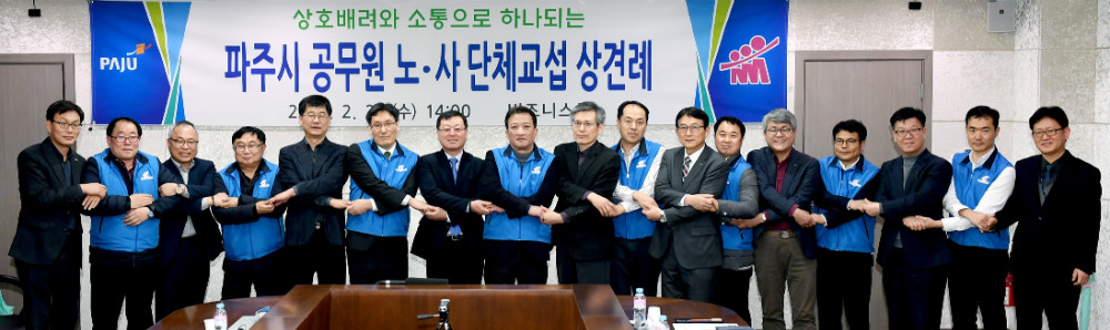 노사 양측 대표교섭 위원인 김준태 파주시 부시장과 이덕천 노조위원장 등 교섭위원 20여명이 참석한 가운데 상견례는 양측 대표교섭 위원장 인사말, 단체교섭 요구안에 대한 노조측 제안 설명, 요구안에 대한 파주시의 입장 설명 순으로 진행됐다.