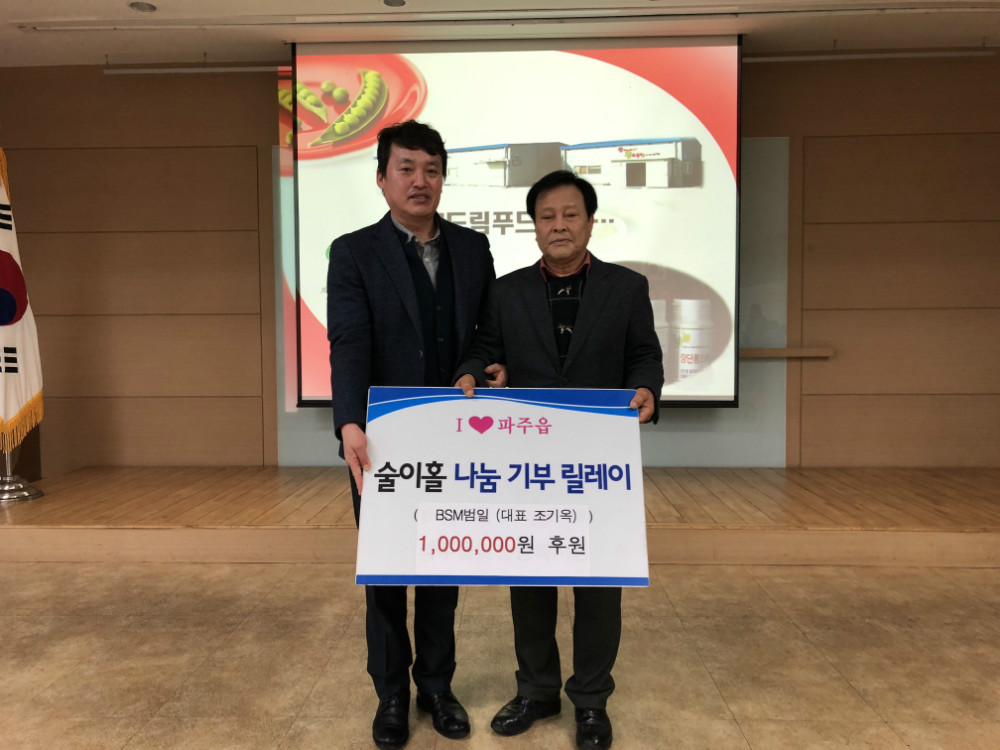 파주시 파주읍 행정복지센터(읍장 이종춘)는 28일 BSM범일(대표 조기옥)에서 이웃돕기 성금으로 현금 100만원을 후원 받았다고 밝혔다.