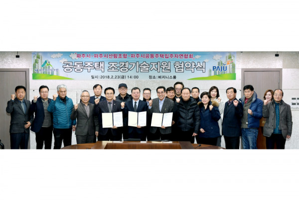 파주시는 지난 23일 파주시청 비즈니스룸에서 김준태 파주시 부시장과 이성렬 파주시산림조합 조합장, 김시헌 파주시 공동주택 입주자 연합회 회장 등이 참석한 가운데 ‘공동주택 조경기술 지원 협약’을 체결했다.