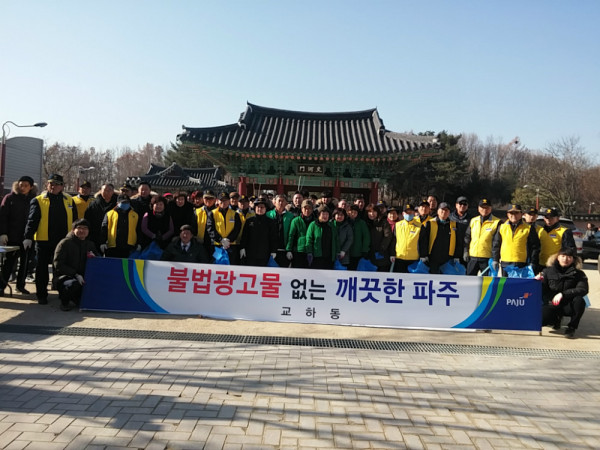 파주시 교하동행정복지센터는 19일 주민자치위원회, 실버경찰대, 새마을 등 민간단체 50여명과 합동으로 불법광고물 정비 활동을 실시했다.