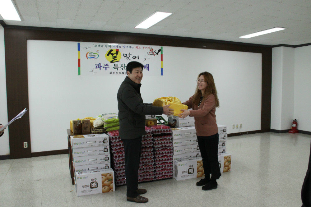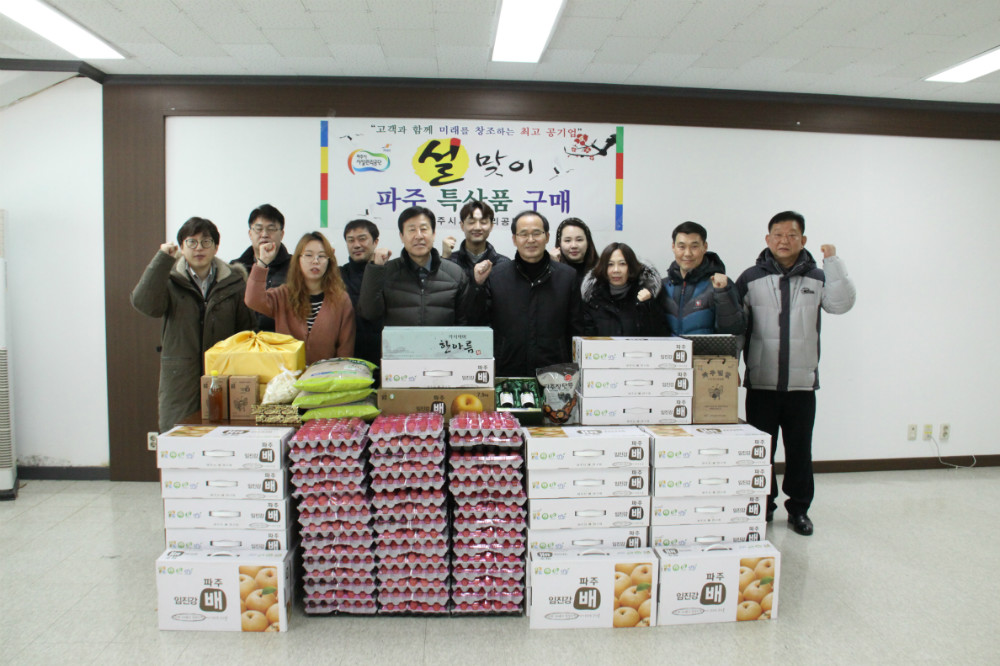 파주시시설관리공단(이사장 직무대행 황수진)에서는 2월12일(월) 민족최대의 명절인‘설’을 맞이해 어려운 지역경제 활성화에 이바지하고자 직원들의 자발적인 참여로 관내 특산품 구매운동을 실시하였으며, 총 39개 품목을 대상으로 2월5일부터 5일간 구매운동을 실시, 총 90만원 상당의 지역 특산품 구매하였다.