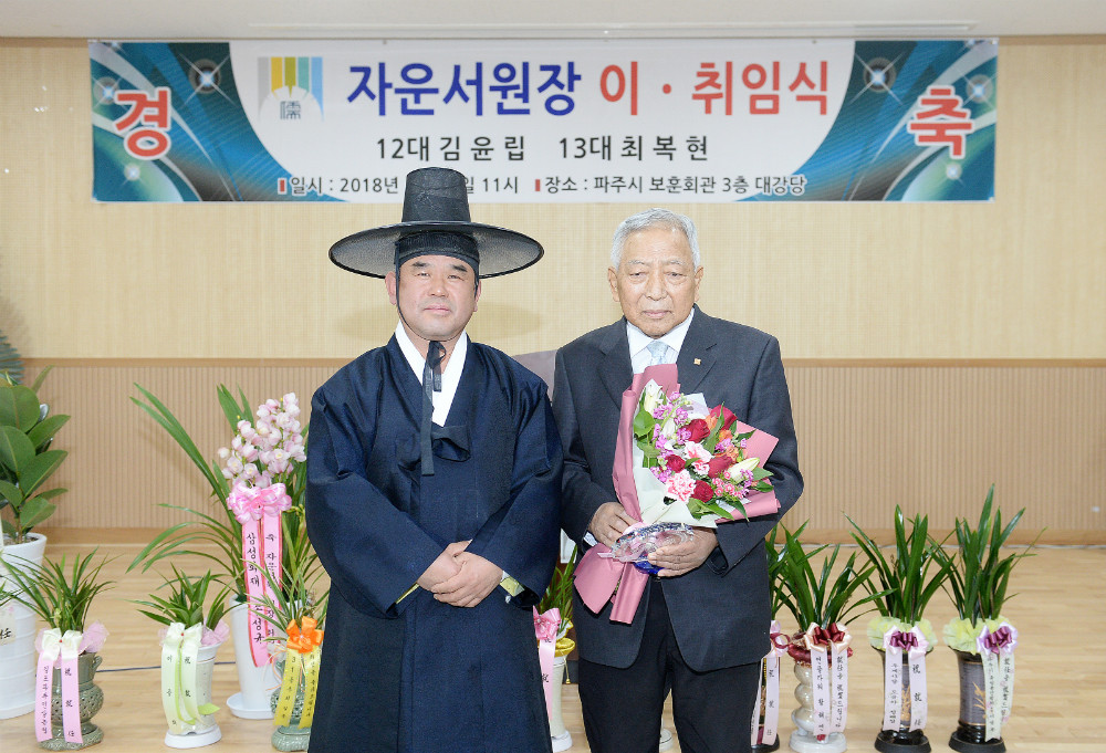 파주시는 16일 보훈회관 대강당에서 제12대 김윤립 자운서원장의 이임식과 제13대 최복현 자운서원장의 취임식이 열렸다고 밝혔다.
