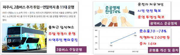 이러한 노력으로 지난 해는 운행횟수준수율이 70%에서 78%로 크게 개선됐으며 2018년에도 경기도 광역버스 준공영제 사업 참여 및 2018년 맞춤형 따복버스 노선 선정 등 시민 편의가 증진될 수 있는 정책을 적극 반영할 계획이다.