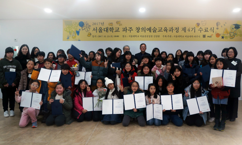 파주시와 서울대학교 미술대학이 헤이리 신양전시관에서 개설 중인 ‘서울대학교 파주 창의예술교육과정’이 지난 23일 학생과 학부모, 파주시와 서울대학교 관계자 약 100여명이 참석한 가운데 2017년도 제4기 수료식을 가졌다.