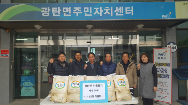 지난 20일 기산2리 마을회(이장 김영철)에서 10kg 백미 30포를 광탄면(면장 이승욱) 광탄면에 기탁했다.