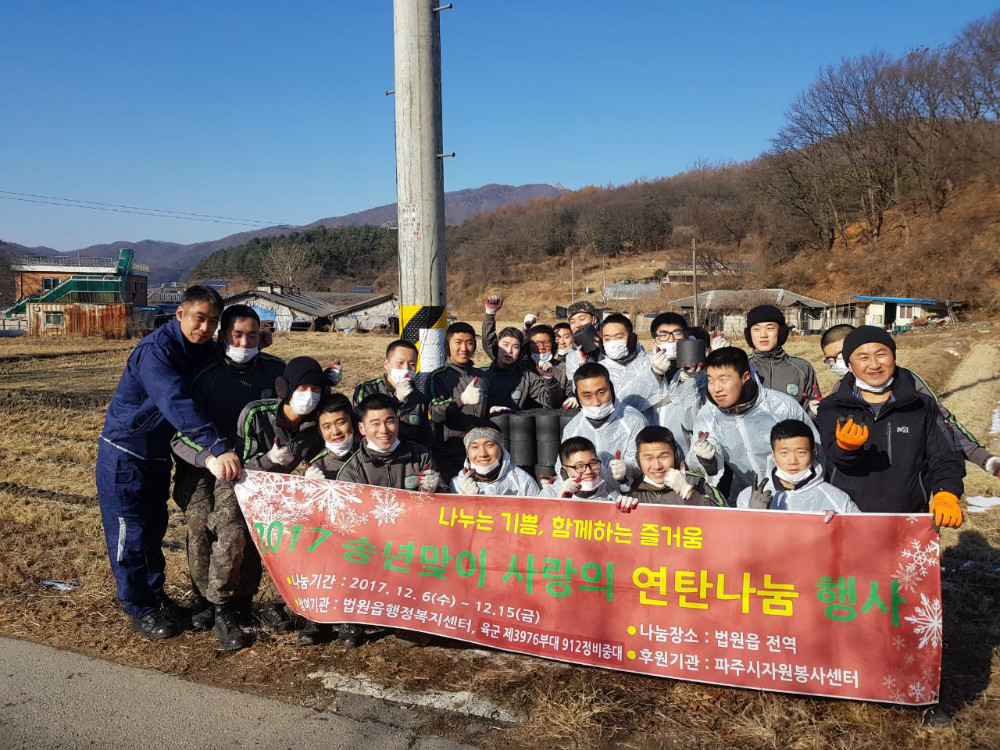 이번 연탄 나눔 행사에는 법원읍에 주둔하고 있는 제3976부대 912정비중대, 육군 제6997부대, 공군 제8218부대 군장병과 법원읍상가번영회(회장 이성수), 한솔지역아동센터(센터장 박진주) 등 100여명의 군장병과 자원봉사자들이 함께했다.