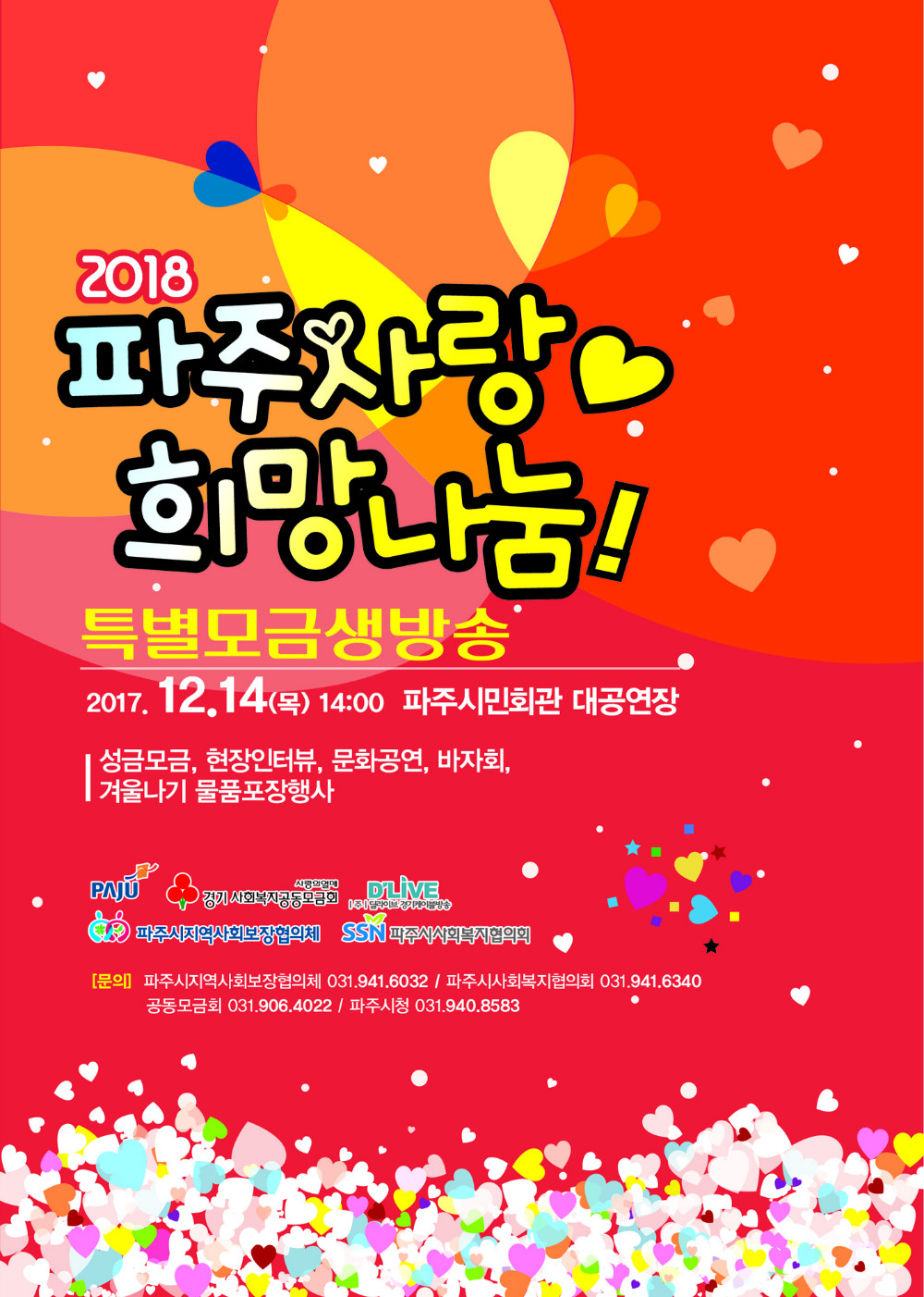 파주시는 오는 14일 오후 2시부터 4시까지 시민회관 대공연장에서 기관․단체, 기업체, 일반시민이 참여하는 ‘2018 파주사랑♡ 행복나눔!’ 생방송모금행사를 개최한다.