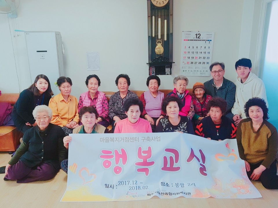 파주시문산종합사회복지관(관장 정시몬) 이동복지팀은 파주읍(파주2리, 봉암2리, 봉서2리) 마을회관을 마을복지거점센터로 활용하여 어르신들에게 다양한 복지, 문화, 교육지원을 통해 무료한 삶을 달래고 삶의 질을 증진시키기 위한 행복교실 프로그램이 2017년 12월 5일(화) 개소식을 시작으로 3개월(총 24회기)간 진행된다.