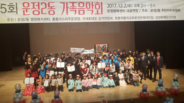 이날 음악회는 ‘운정2동 가족의 날(매년 12월 첫째 주 토요일)’을 맞아 운정 주민들이 음악을 통해 가족, 이웃과 교류하며 사랑을 나누는 자리를 만들기 위해 개최됐다. 행사는 해솔초등학교 오케스트라 학생들의 축하공연을 시작으로 운정2동 가족봉사단 우수단지 표창 수여, 운정1․2․3동 주민이 직접 참가해 경연하는 가족음악회 공연, 가족음악회 시상 순으로 진행됐다.
