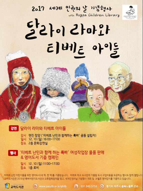 파주시 교하도서관은 티베트 난민을 돕는 록빠(Rogpa)가 운영하는 록빠어린이도서관과 맺은 협약에 따라 10일 세계인권의날 기념행사를 개최한다.