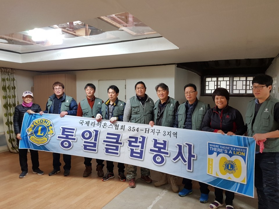 문 모씨 집은 낡은 기와집으로 비가 새 천장 한 구석이 뚫렸고 집 안 곳곳에 곰팡이로 인해 냄새가 심한 상태였다. 이 소식을 들은 통일라이온스클럽은 춥고 비오는 날씨에도 불구하고 천장 보수, 전등 교체, 장식장 설치, 도배 등을 실시했다.