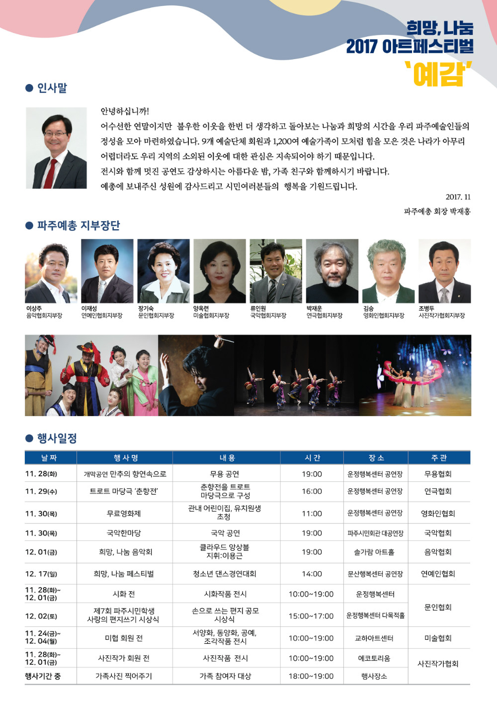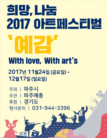 파주시가 주최하고 (사)한국예총 파주지회(회장 박재홍)가 주관하는 ‘희망·나눔 2017 아트페스티벌 예감(藝感)’이 28일부터 12월 1일까지 운정행복센터에서 개최된다.