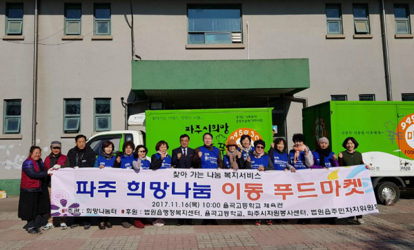 ‘희망나눔 이동 푸드마켓’은 교하동에 소재한 ‘파주시 푸드마켓’을 이용하기 어려운 저소득층을 대상으로 15종의 식료품을 직접 싣고 와 참여한 저소득층 주민들에게 배부하는 것으로 이날 행사에는 파주희망나눔터(대표 최명성), 소비자교육중앙회 파주시지회(회장 김순자), 법원읍 상가번영회와 여성의용소방대, 법원읍주민자치위원회 등 자원봉사자 30여명이 참여했다. 또한 이동마켓이 진행되는 동안 법원읍 주민자치센터 라인댄스팀의 공연도 펼쳐져 단순 나눔 활동에서 나아가 소외계층과 함께하는 축제로 발전시켰다.