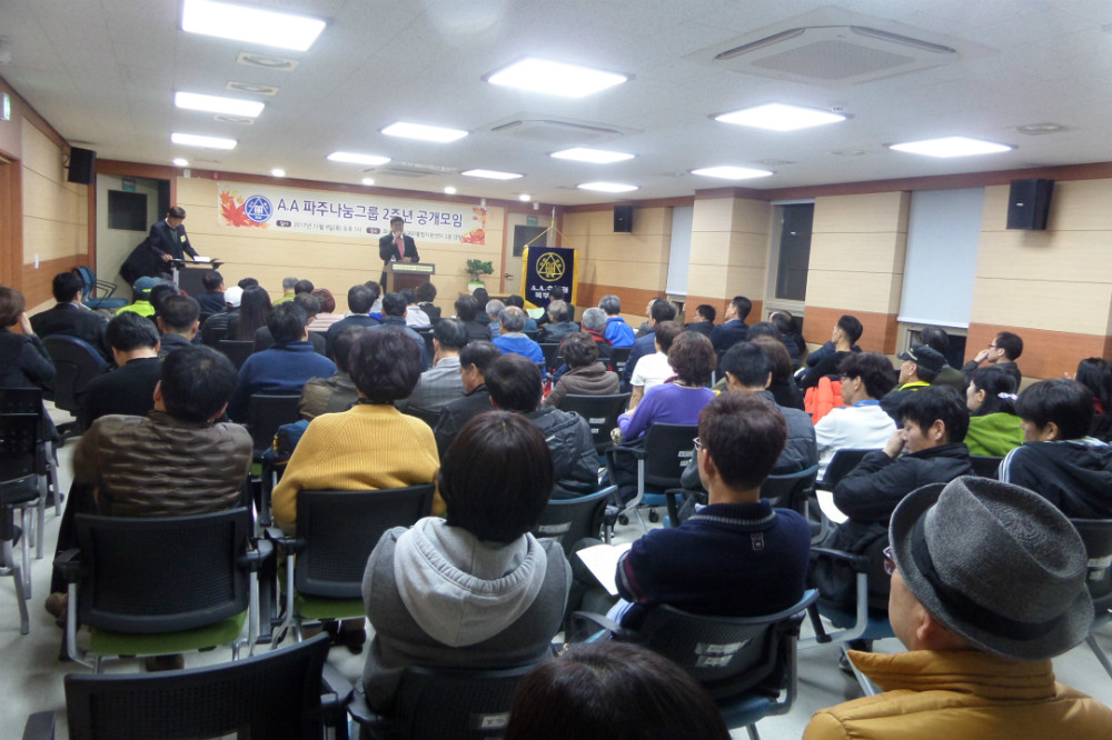 파주시중독관리통합지원센터는 알코올중독자의 재활 및 그 가정의 회복을 돕고 지역주민의 중독폐해예방을 위해 힘쓰는 기관으로 현재 A.A. ‘파주나눔’ 그룹 모임은 매주 목요일 오후 4시에 본 센터 프로그램실에서 열린다.