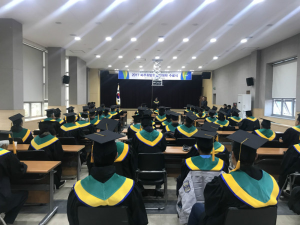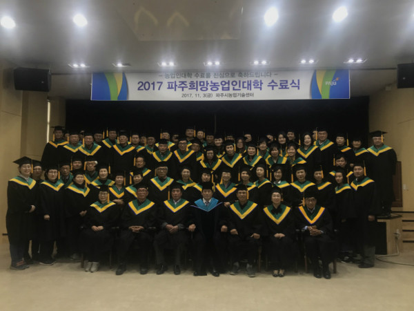 파주시는 3일 농업기술센터 농업과학교육관 3층 교육장에서 2017학년도 제11기 파주희망농업인대학 수료식을 수료생 77명이 참석한 가운데 개최했다.