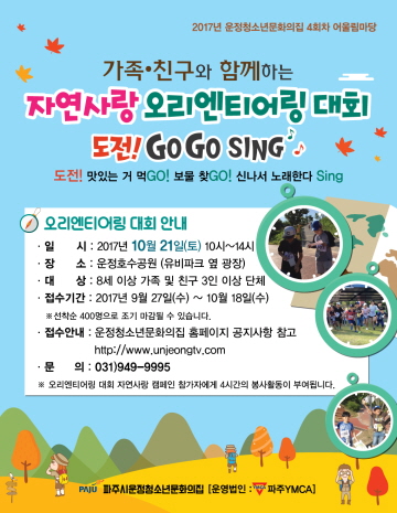 파주시는 10월 21일 운정호수공원에서 운정청소년문화의집을 통해 청소년 사랑과 존중의 메시지를 전달하고자 ‘2017년 제4회 청소년 어울림 마당 가족·친구와 함께하는 자연사랑 오리엔티어링 대회’를 개최한다.