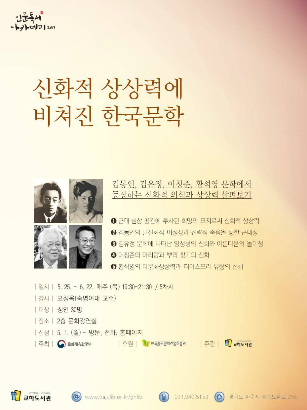 파주 교하도서관, 인문독서아카데미 4년 연속 선정 한국출판문화산업진흥원이 주최하고 문화체육관광부가 후원하는 인문강연 공모사업 ‘인문독서아카데미’에 교하도서관이 4년 연속 선정됐다. 올해는 학문간 통섭형 주제로 기획하고 각 주제가 조화로우며 기존 강연과 차별성이 있는지 등에 중점을 두고 심사해 전국 60개 기관이 선정됐다. 교하도서관은 문학을 기본으로 한국신화, 미술, 철학, 경제를 융합한 강연시리즈를 기획해 각 주제별로 5강씩 총 20강의 고급 인문강좌를 제공한다. 첫 번째 주제는 ‘신화적 상상력에 비쳐진 한국문학’으로 5월 25일부터 5주간 매주 목요일 오후 7시30분 표정옥 숙명여대 교수가 김동인, 김유정, 이청준, 황석영 등의 작품과 관련해 강연할 계획이다. 나머지 세 주제는 9월부터 교하, 한빛, 해솔도서관에서 나눠 진행한다. 교하도서관은 ‘경제학자의 문학살롱’의 저자 박병률 기자가, 한빛도서관은 ‘미술관 옆 인문학’의 박홍순 저자가 강연한다. 해솔도서관은 자유학년제 연계 기획으로 해솔중학교를 초청해 ‘앨리스의 이상한 인문학’ 이남석 저자와 만남을 가질 예정이다. 교하도서관은 강연 주제도서 및 강사 추천도서 등을 함께 읽는 문학 독서동아리도 모집한다. 5월 강좌는 교하도서관 홈페이지를 통해 신청할 수 있다. 파주시 교하도서관 관계자는 “이번 인문독서아카데미를 통해 문학 독서의 효용과 함께 통섭형 강의로 다양한 시각과 메타적 상상력을 키울 수 있을 것으로 기대된다”고 말했다.