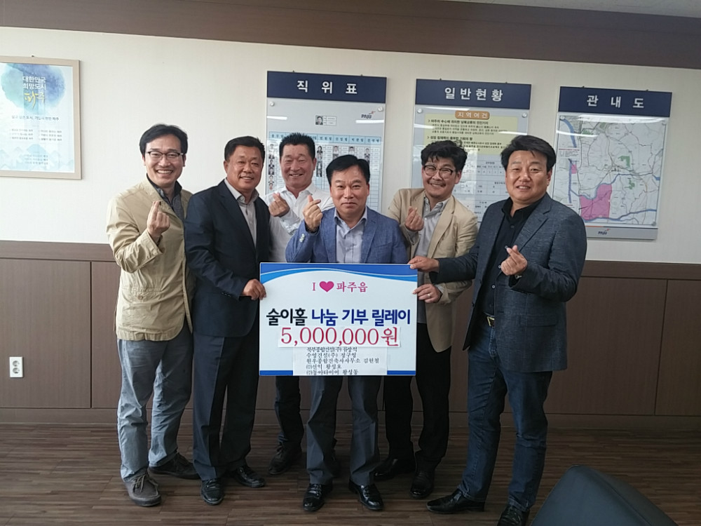 파주시 파주읍, “술이홀 나눔기부릴레이”로 후원 줄이어 “북부종합건설(주), 수영건설(주), 원우종합건축사사무소, ㈜신익, ㈜동아타이어에서 5백만원 후원” 파주시 파주읍(읍장 이영선)이 지난 1일 북부종합건설(주) 류장석, 수영건설(주) 정구영, 원우종합건축사사무소 김현철, ㈜신익 황성호, ㈜동아타이어 황성동 대표가 “술이홀 나눔기부릴레이”에 동참해 각 100만원씩 총 5백만원을 후원했다고 밝혔다. 이번 후원은 이영선 파주읍장의 “술이홀 나눔기부릴레이” 바톤을 이어받아 북부종합건설(주) 류장석 대표이사 등 5명이 참여했다. 북부종합건설(주) 류장석 대표이사와 수영건설(주) 정구영 상무이사, ㈜동아타이어 황성동 대표는 “파주읍이 읍면동 복지허브화 선도지역이 된 것은 파주시의 자랑인 만큼, 작은 정성을 보태어 어려운 이웃을 돕는데 일조하고 싶다”고 참여 이유를 밝혔다. ㈜신익 황성호 대표이사는 이번 후원뿐만 아니라, 관내 저소득 아동에게 지속적인 문구후원을 약속했다. 원우종합건축사사무소 김현철 대표는 90세 노모와 살고 있는 아동의 딱한 사정을 듣고 “부모를 일찍 여의고 힘들게 보낸 나의 어린시절이 생각났다”며, “부모의 부재와 질풍노도의 시기를 겪고 있는 청소년이 사회의 당당한 일꾼으로 성장할 수 있도록 최선을 다해 돕겠다”고 말했다. 이영선 파주읍장은 “술이홀 나눔기부릴레이 사업에 참여해주신 후원자님께 깊은 감사를 드리며, 우리읍이 읍면동 복지허브화의 성공모델이 될 수 있도록 최선을 다하겠다”고 말했다. 한편 술이홀 나눔릴레이는 기부자 1명에서 시작하여 나눔실천에 동참할 수 있는 2명을 지목하는 릴레이방식으로, 작년 11월부터 시작되어 후원금 3천여만원이 모금되어 저소득 주민에게 맞춤형서비스를 제공하는데 사용될 계획이다.