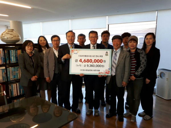 (사)참사랑실천회 파주지회, 2년 연속 디딤씨앗통장 후원금 전달 (사)참사랑실천회 파주지회는 지난 4월 27일 파주시청을 통해 저소득층 아동들을 위한 ‘디딤씨앗통장사업’에 468만원을 후원했다. 이번 후원은 지난 해부터 2년째 이어오는 후원(누적 후원금 : 936만원)으로 관내 13명의 아동이 성인이 될 때 까지 ‘디딤씨앗통장’ 적립에 지속적인 후원을 약속했다. 디딤씨앗통장사업은 저소득층 아동들의 사회진출시 학자금, 취업, 창업, 주거마련 등에 소요되는 초기 비용 마련을 위한 자산형성 지원사업이다. 아동의 디딤씨앗통장 계좌에 매월 3만원씩 입금하는 방식으로 후원된다. (사)참사랑실천회 파주지회는 독거노인, 결손가정, 기초생활수급 가정 등을 돕는 비영리 후원단체로 매년 쌀, 김치 등 후원품 전달과 독거노인 식사대접, 장학금 전달 등 나눔을 실천하고 있다. 지난 2006년부터 총 7억원에 달하는 후원금을 통해 참사랑을 실천하고 있다. 김승기 (사)참사랑실천회 파주지회장은 “매년 나눔활동을 하면서 어려움도 많았지만 도움을 받은 독거노인과 아동들이 보내준 감사의 편지를 받을 때 마다 나눔의 즐거움과 함께 큰 힘을 받고 있다“고 말했다.