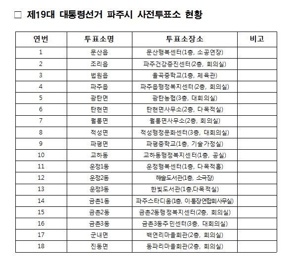 파주시, 19대 대통령 선거 선거인수 34만 533명 최종확정 파주시는 제19대 대통령 선거 선거인수를 34만 533명으로 지난 27일 최종 확정했다. 이는 지난 제18대 대통령 선거 선거인수 30만 1천967명 보다 3만 8천566명 늘어난 수치다. 지난 해 실시된 제20대 국회의원 선거의 선거인수 33만 3천945명 보다는 6천588명 늘어났다. 제19대 대통령 선거는 5월4일부터 5월5일 이틀간 오전 6시부터 오후 6시까지 각 읍·면·동별 사전투표소에서 사전투표를 실시한다. 5월 9일 본 투표 및 개표를 거쳐 최종 당선자를 확정하게 된다. 사전투표에 참여하는 유권자는 자신의 주소지와 관계없이 가까운 사전투표소에서 본인 신분증 확인 후 투표 가능하다. 파주시 관계자는 “시민들에게 정확하고 신속한 투표를 지원하기위해 파주시 홈페이지 선거인명부 열람 창에서 자신의 투표소와 선거인명부 등재번호를 확인할 수 있도록 개설했다”며 “이를 통해 본인의 등재번호를 사전에 숙지하거나 발송된 투표안내문을 지참할 경우 신속하게 투표에 참여할 수 있다“고 말했다.